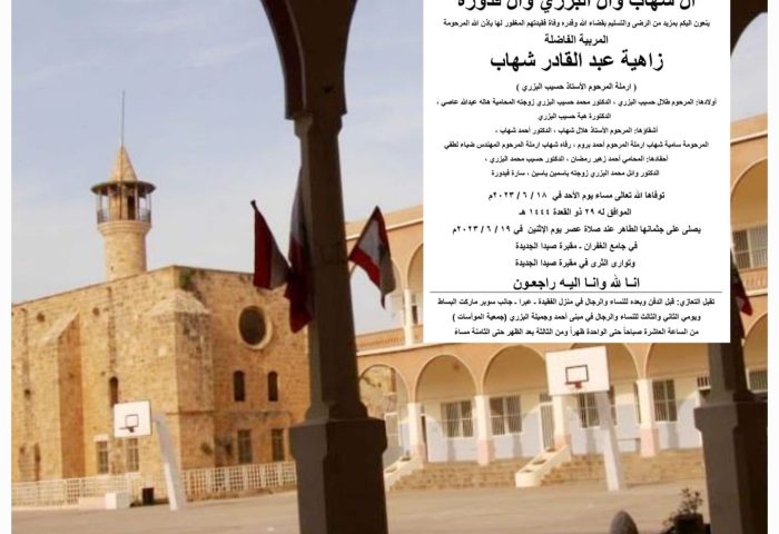 بتسليم بقضاء الله وقدره، ينعي رئيس واعضاء المجلس الإداري لجمعية المقاصد الخيرية الإسلامية في صيدا وفاة المربية الكبيرة ومديرة ثانوية المقاصد الإسلامية السابقة المرحومة السيدة زاهية عبد القادر شهاب، زوجة الاستاذ الكبير المرحوم حسيب البزري، ووالدة عضو المجلس البلدي لمدينة صيدا الدكتور محمد حسيب البزري.