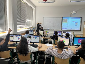 Grade 6 students viewing the output of their makecode script on a real microbit